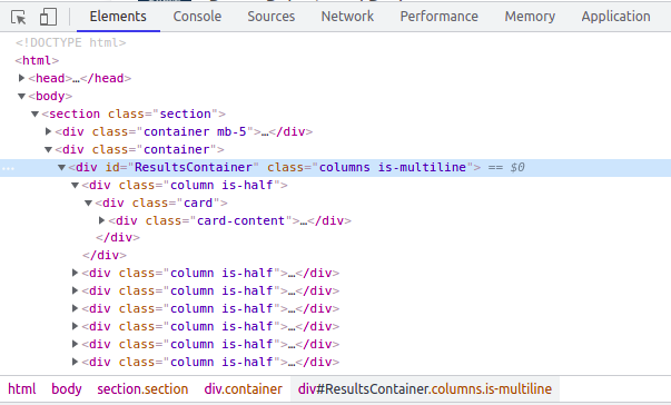 Tras inspeccionar el código HTML según se ha descrito anteriormente, vemos que las ofertas de trabajo están contenidas en elementos div con clase \"card\", a su vez contenido en un div con clases \"column is-half\". Todos estos elementos div están a su vez contenidos en un elemento div con el atributo id con valor \"ResultsContainer\". Por tanto, éste es el primer elemento a partir del cual empezar la búsqueda: