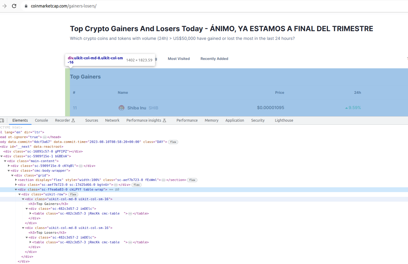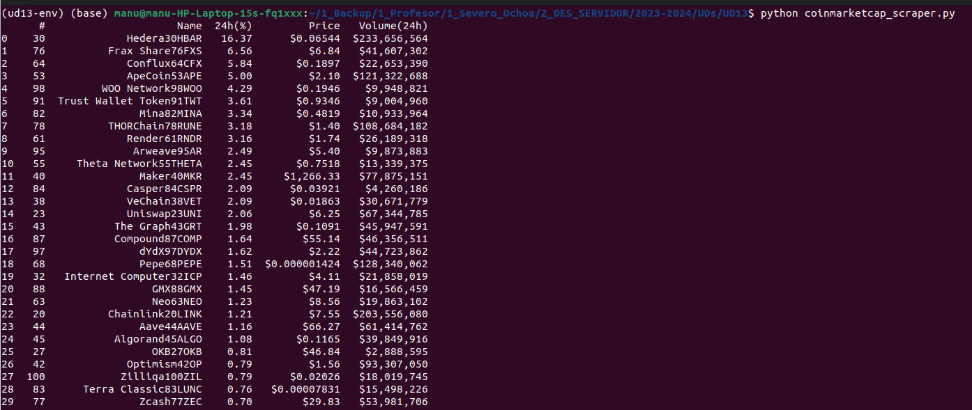 Queremos convertir los datos de la tabla de las criptomonedas que más ganan, del apartado anterior, a un dataframe de pandas.