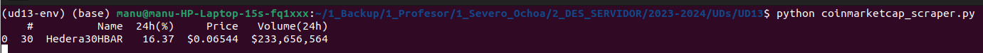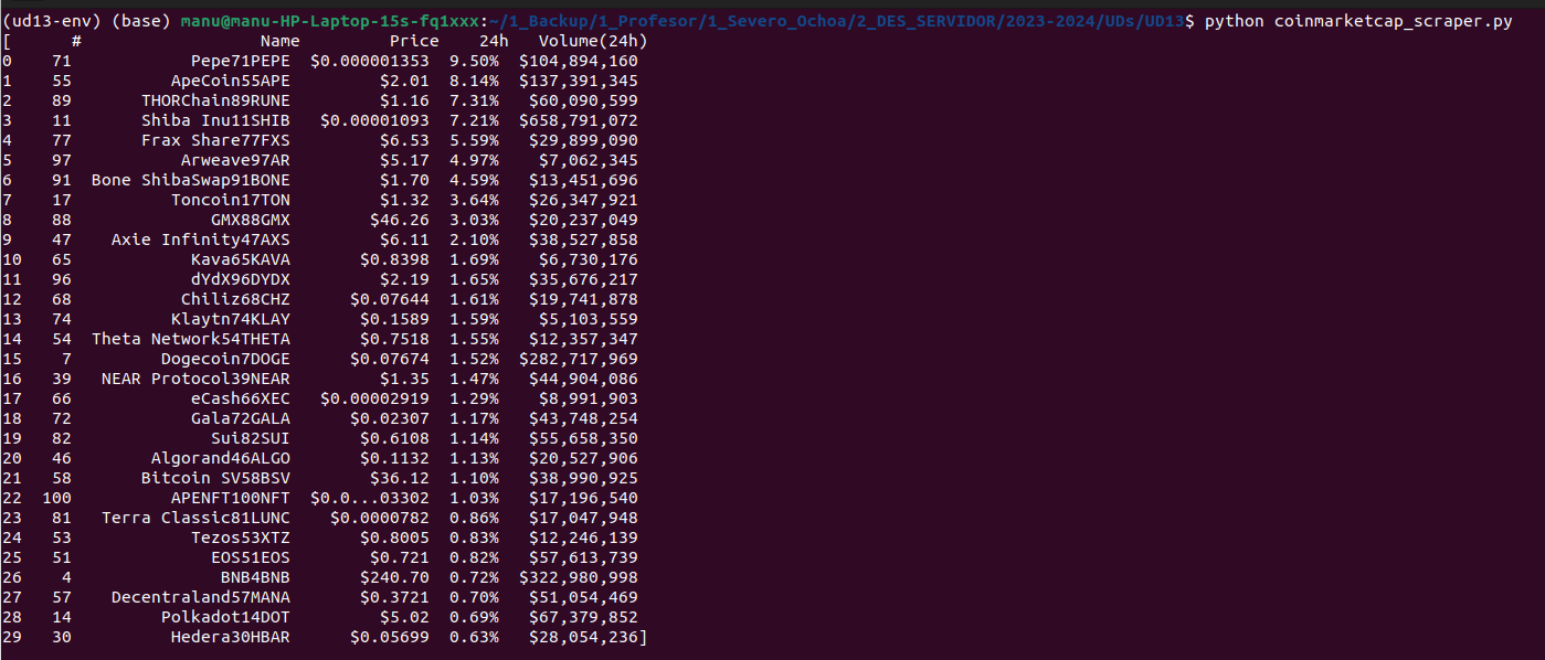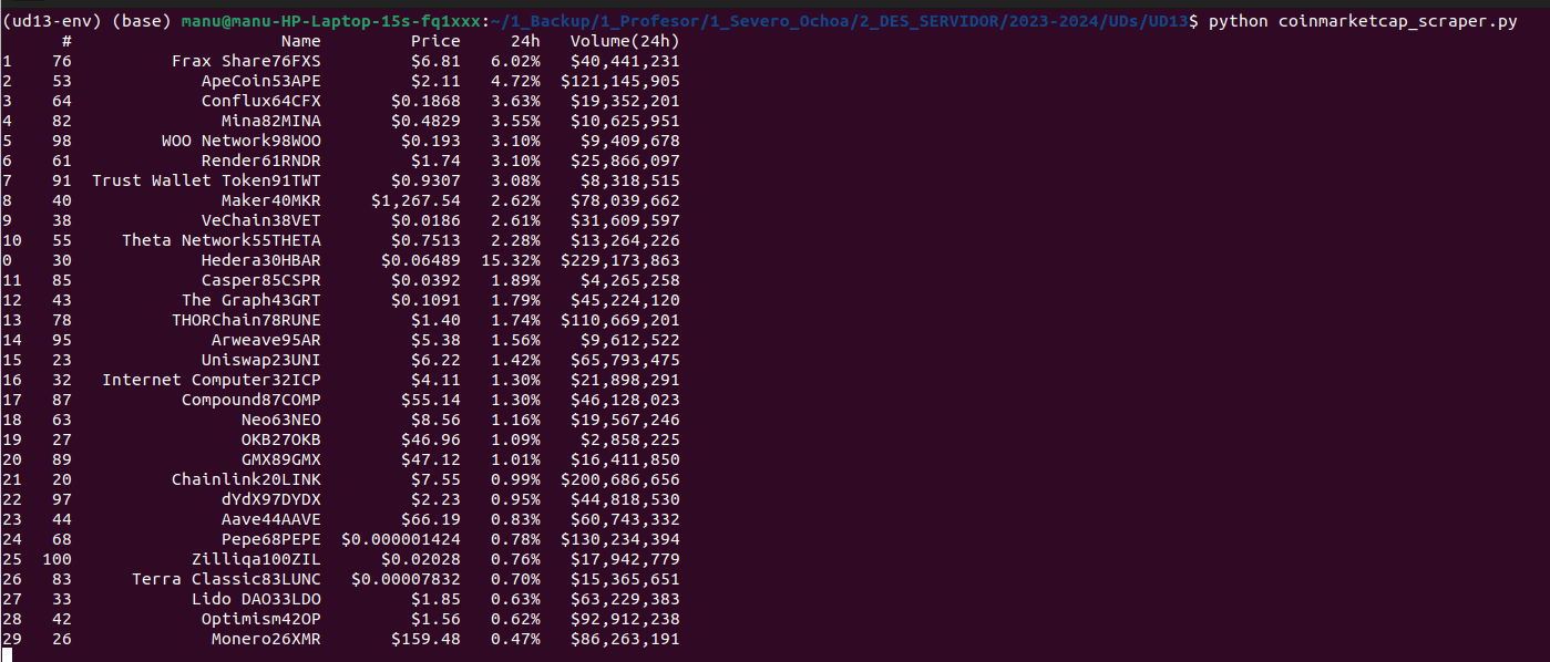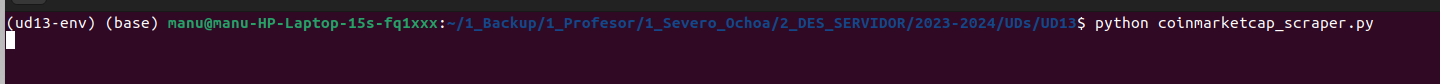 Para lanzar este script, lo guardamos primero en un fichero con extensión .py (por ejemplo fake_jobs_scraping.py), seguidamente activamos el entorno virtual desde el terminal, y lo ejecutamos de la forma: