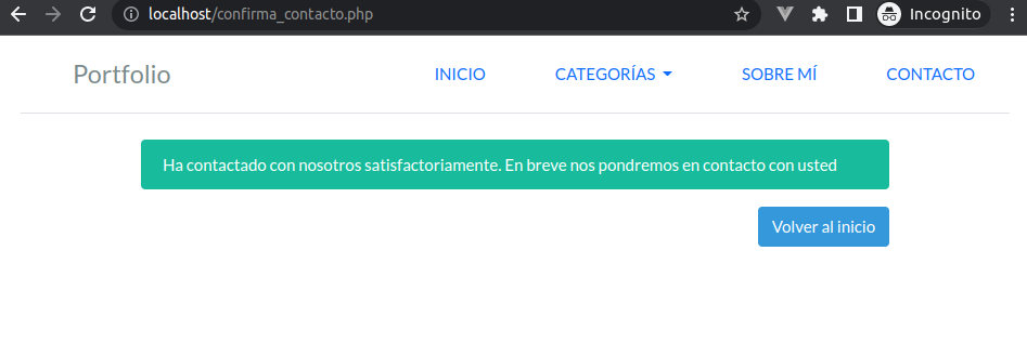 Bien, ya tenemos operativo el formulario, pero ahora queremos mostrar un mensaje al usuario que indique que todo ha ido correctamente durante el envío de los datos. Para ello creamos una nueva página llamada confirma_contacto.php, con el siguiente contenido: