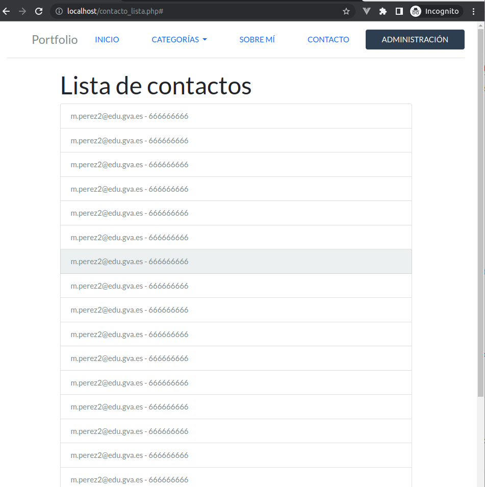 A nuestra aplicación le falta un pequeño detalle: no somos capaces de poder ver los contactos que nos han realizado. Para ello, vamos a utilizar el menú ADMINISTRACIÓN creado en la unidad anterior. Al pulsar sobre esta opción de menú (recuerda que solo se activa cuando se simula estar autenticado en el sistema), nos llevará a la lista de contactos, que será la página contacto_lista.php, con el siguiente contenido: