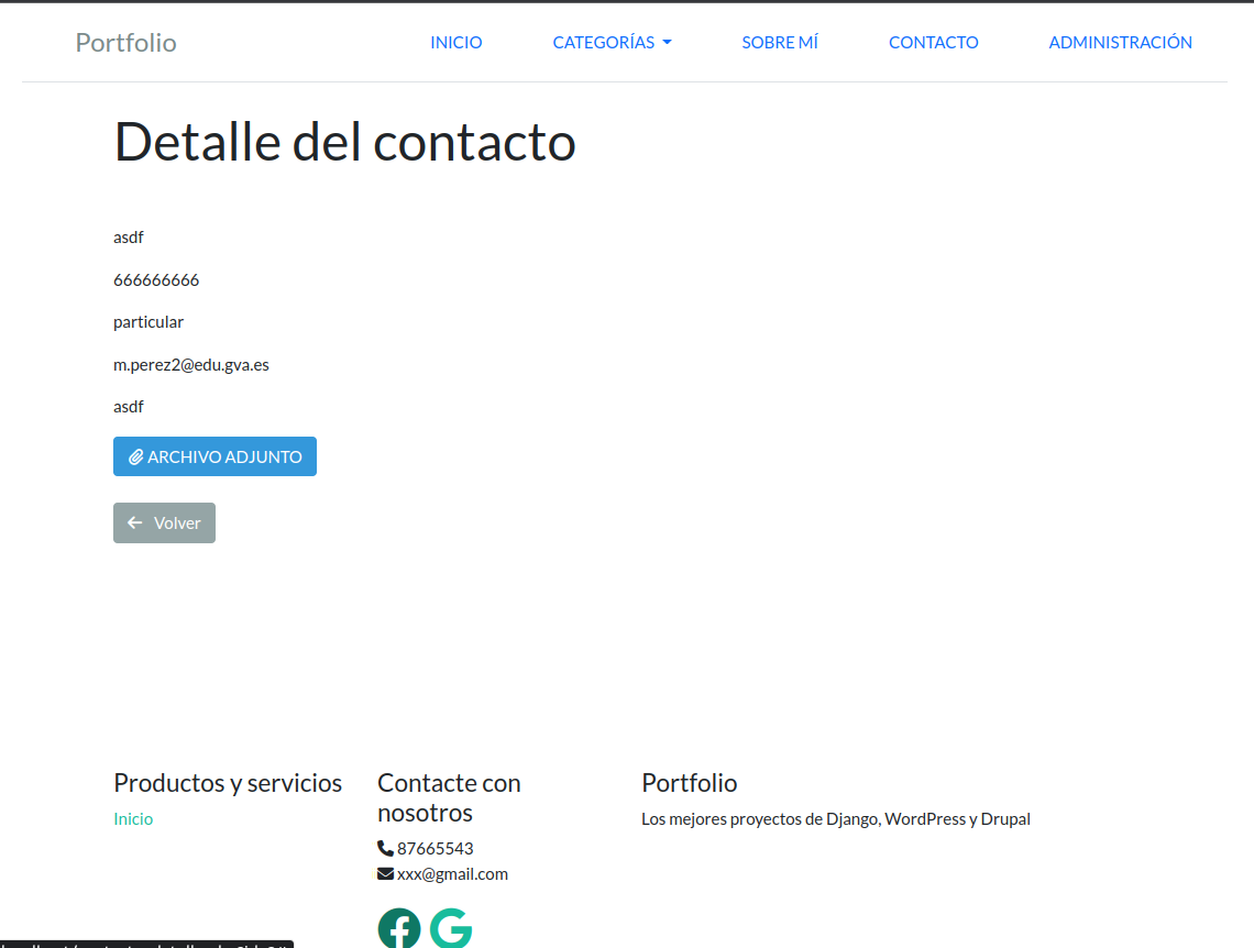 - Al pulsar sobre cada registro, acceder a otra página donde se mostrasen los detalles del contacto, así como el archivo adjunto (si existe). En este caso deberíamos haber introducido un ID en cada contacto, para poder pasarlo por parámetro en la URL a la nueva página, y recuperar el detalle del contacto (como hicimos en el caso de los proyectos).