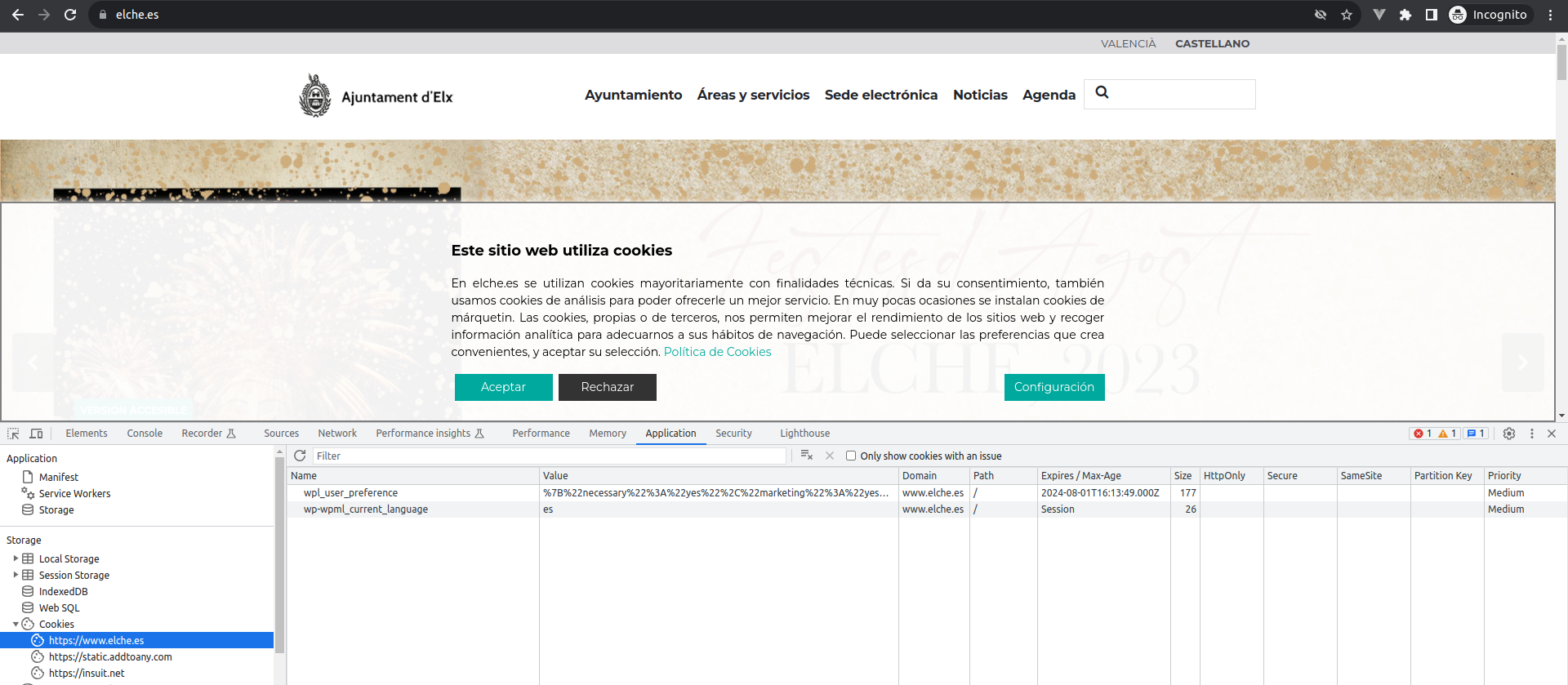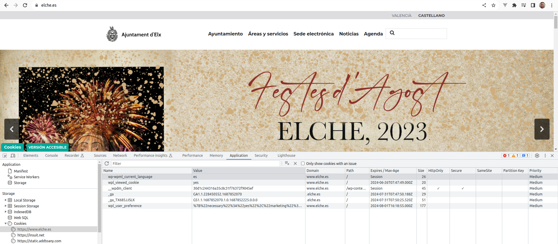 Si consultamos por ejemplo el sitio web del ayuntamiento de Elche, podremos ver, mediante las herramientas de desarrollador del navegador (depende del navegador que estemos utilizando) las cookies que se han almacenado. Podemos ver en el panel de la izquierda las cookies guardadas, por cada sitio web: